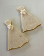 Iced cookie favors come individually wrapped in clear bags with a single organdy or satin ribbon and favor tags. Ribbon style and color is chosen to best complement the cookie. Learn more here »
