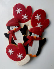 When the snow falls and the winter wind whips, keep the chill out with these cold weather treats. Each box includes 12 individually wrapped decorated cookies - 3 pairs of mittens and 6 penguins bundled up in the color of your choosing.