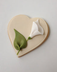 The picture of elegance, these exquisite shortbread hearts are iced in off-white and decorated with a white fondant calla lily flower.