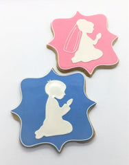 Celebrate your child's Communion with these sweet silhouette cookies of a child kneeling in prayer. Choose either a boy or a girl. Boys are done with a sky blue background. Girls are done with a pink background. If you would prefer a different background color, please let us know. Cookies are approximately 4.5 inches.