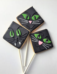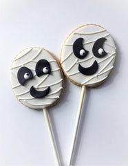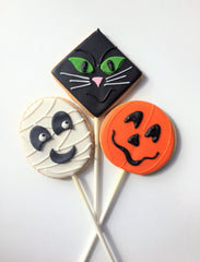 A few more cookie pops to add to the mix - mummies, black cats and jack-o-lanterns! Pops are individually packaged and perfect treats for school Halloween parties. Faces vary.