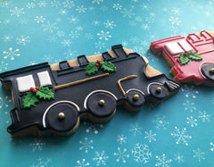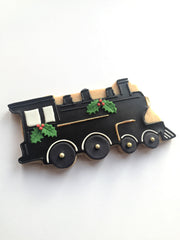 All aboard! Next stop North Pole! This classic holiday train is available in black or red with gold details and fondant holly leaves. Get your ticket today!