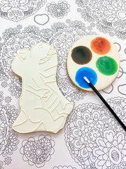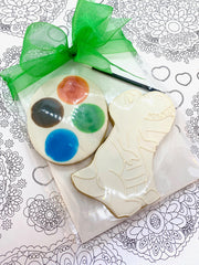 Activity and sweet treat all in one - this paint your own dinosaur cookie is a fun birthday party craft and favor. Package includes one dinosaur dress cookie to paint, one edible paint palette cookie and one brush. Simply wet brush with a small amount of water, hydrate color and paint color onto cookie. Works like watercolor! For specific paint colors or custom cookie designs, please send us an email.