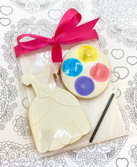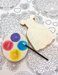 Activity and sweet treat all in one - this paint your own princess dress cookie is a fun birthday party craft and favor. Package includes one princess dress cookie to paint, one edible paint palette cookie and one brush. Simply wet brush with a small amount of water, hydrate color and paint color onto cookie. Works like watercolor! For specific paint colors or custom cookie designs, please send us an email.