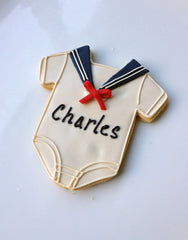 A blue fondant collar with thin white stripes and a small red bow transform a simple baby onesie into a mini sailor suit. Add the baby's name to the front of the suit for a truly personal touch.