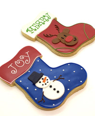 If you're looking for a personalized treat this season, these cute stocking cookies are for you! Stockings come individually packaged in a window box. Each box holds 3 to 6 cookies (choose your quantity). Choose your design (reindeer or snowman or a combination of the two) and if you'd like the cookies personalized. We will follow up with you by email for the names for your stockings. If you do not want the stockings personalized, they will come with "Joy" and "Merry" as pictured.